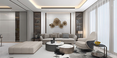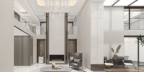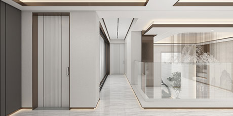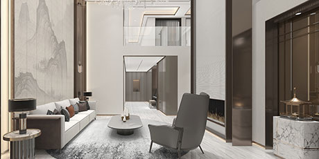 大尺度挑高設計,加上有序交互的幾何形體與線條,讓空間極具延展性。恰到好處的留白,吸取傳統藝術的精髓,拓寬了空間的層次布局,構造空靈,典雅而端莊的東方韻味。壁布山水裝飾、銅元素的點綴,糅合傳統與現代的藝術 氣息。米、白、棕的低飽和基調貫穿整體,將空間映襯的格外素雅簡潔,一些人文細節的融入,交疊中不失親和。