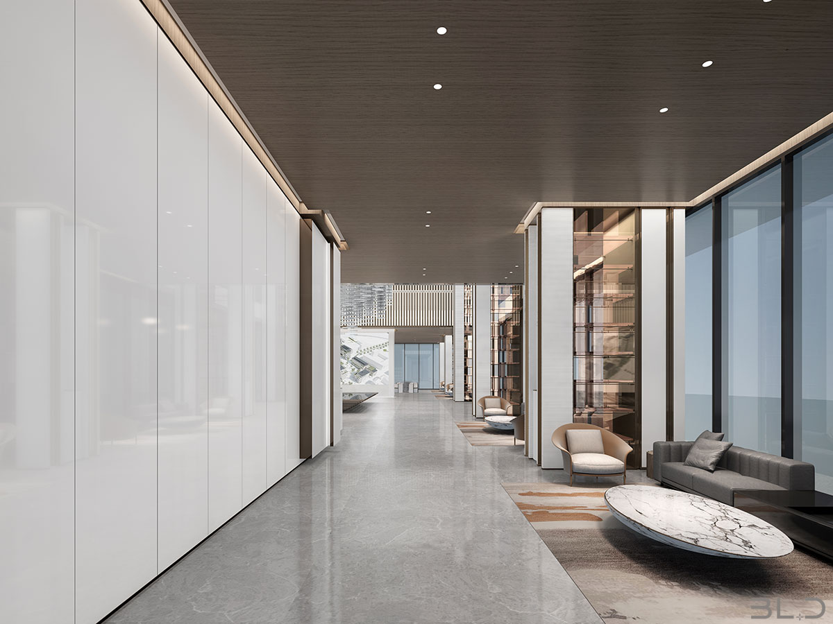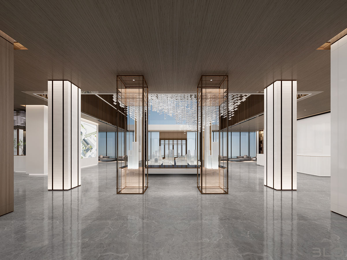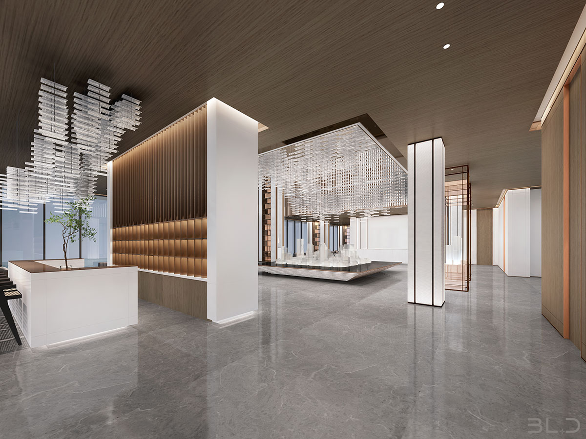 售樓處功能區(qū)分散在整個(gè)空間中,形成流暢清晰的循環(huán),平衡了隱性和顯性之間的關(guān)系,在布局中也融入了未知和交互,以留出更多的想象空間。未知刺激下的人與靜態(tài)物品的互動(dòng),可以為空間注入活力。整個(gè)空間營(yíng)造 出簡(jiǎn)約的空間基調(diào)。帶有紋理的大理石和木制藝術(shù)裝置被引入,以減輕廣闊空間的空虛感。空間中的物品與自然和藝術(shù)相連。只有在與人互動(dòng)時(shí),他們才能開(kāi)始扮演角色。淺色調(diào)平衡了建筑結(jié)構(gòu)的厚重感,也豐富了空間 的層次感。入口處下沉的燈飾結(jié)構(gòu)打破了空曠感,同時(shí)也豐富了視覺(jué)體驗(yàn)。水吧、休息區(qū)和洽談區(qū)緊密相連,共同形成社交的錨點(diǎn)。整個(gè)售樓處以藝術(shù)美學(xué)和極簡(jiǎn)主義為特色,激發(fā)人們與自然的互動(dòng)。