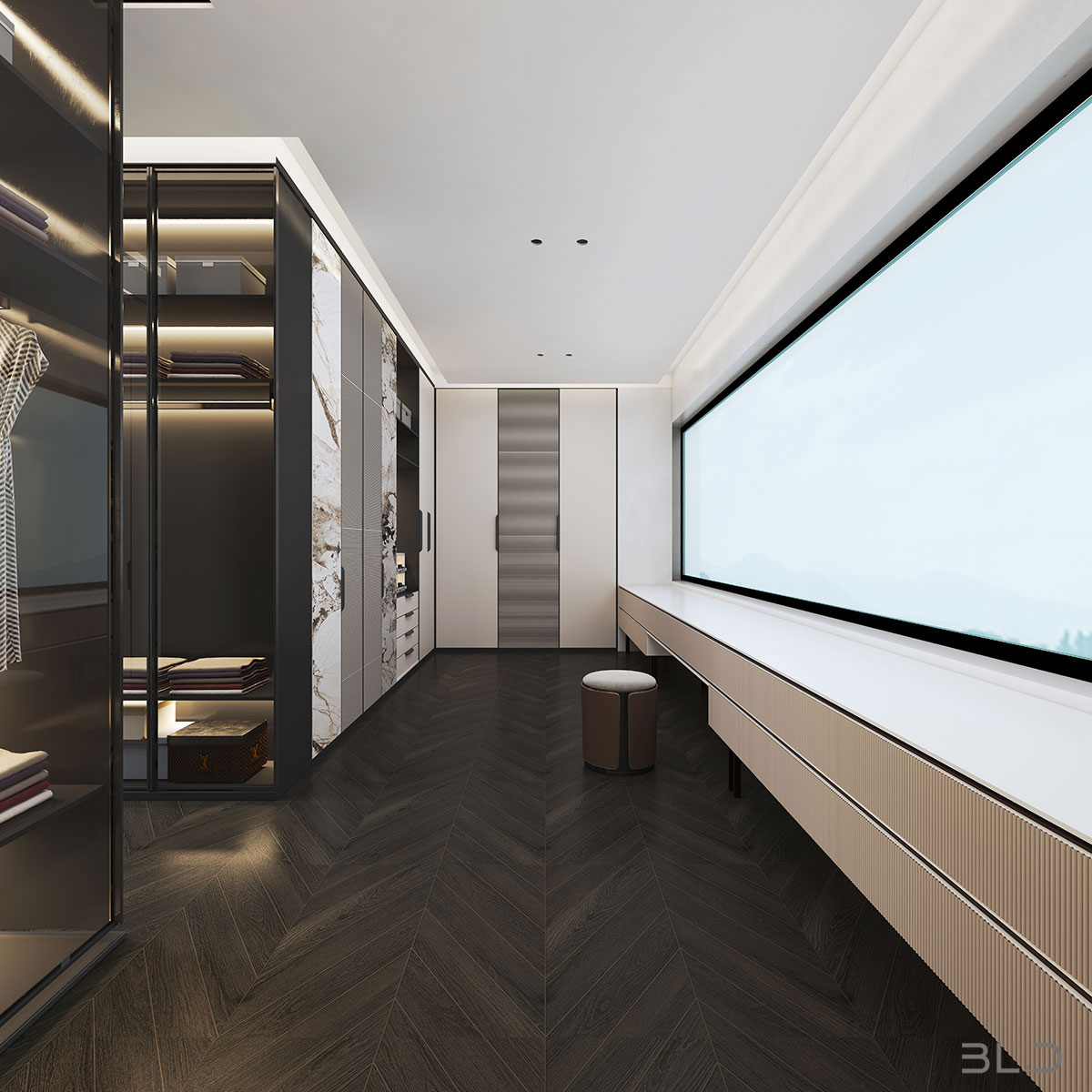 在別墅設計的主要空間之一臥室,在設計上卻不作浮華堆砌,只用干凈洗練的線條建立一個清簡恍如只隱約存在的空間關系,輔以原色為主的軟裝,任由樸素營造一個心靈可以完全放空的環境,在過道、衣帽間和洗手間這樣的次要空間則利用材料營造質感,讓人感嘆莫辜負了這片刻的美好時光。